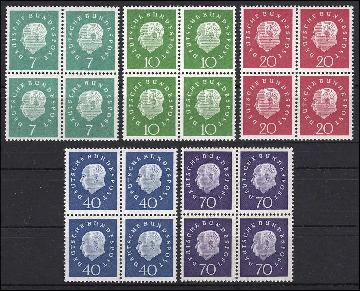 302-306 Heuss 5 valeurs, blocs à quatre, ensemble complet frais **