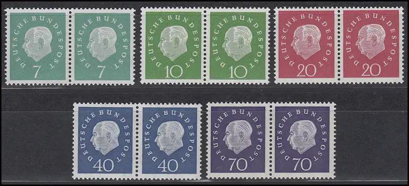 302-306 Heuss 5 valeurs, paires horizontales, ensemble complet frais de port **