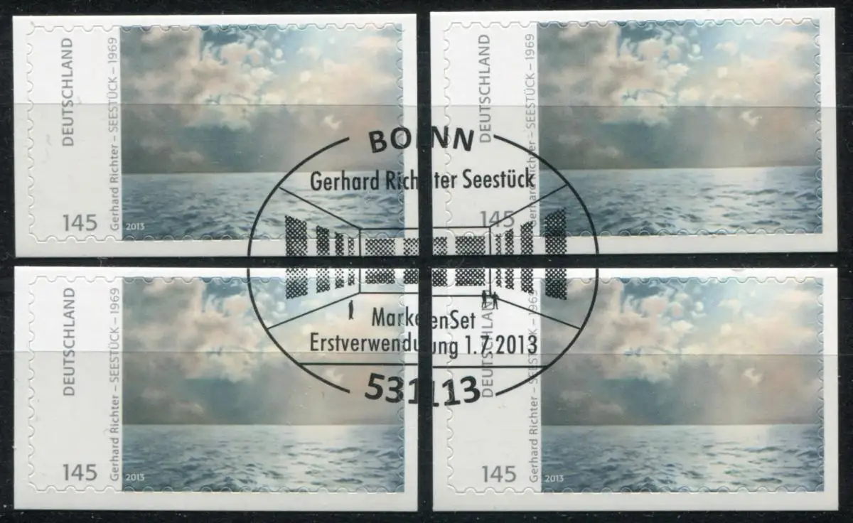 Peinture de Gerhard Richter, Au dos: pour tous les blancs, 4 timbres chacun avec les différents cachets d'utilisation initiale d 'angle Bonn Numéro de catalogue: 3021 Examen: original Référence produit: 50000302103399>P>Attention: Cet article est ou a été répété. L'illustration montre l'un de ces articles en forme d & #39;exemple. La marque livrée a uniquement les caractéristiques indiquées dans la description et peut donc différer de l . Cependant, en particulier pour les marques imprimées, nous nous efforçons de fournir l ’ article illustré. Si cela vous convient, veuillez nous le faire savoir.