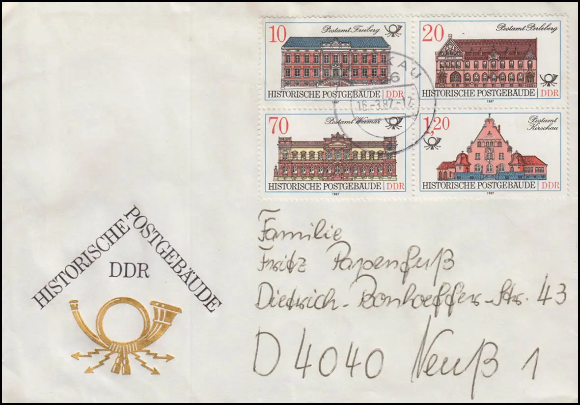 3067-3070 Bâtiment postal: Quadruple bloc-ZD PLF 3069I Lettre LUCKAU 16.3.87 BPP-testé