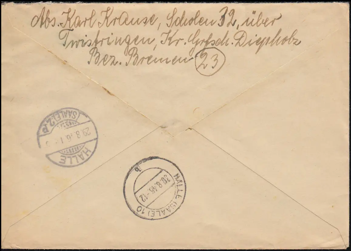31 AM Post 42 Pf MeF R-Bf Not-R-Zettel Feldpost SCHOLEN via TWISTRINGEN 22.8.46