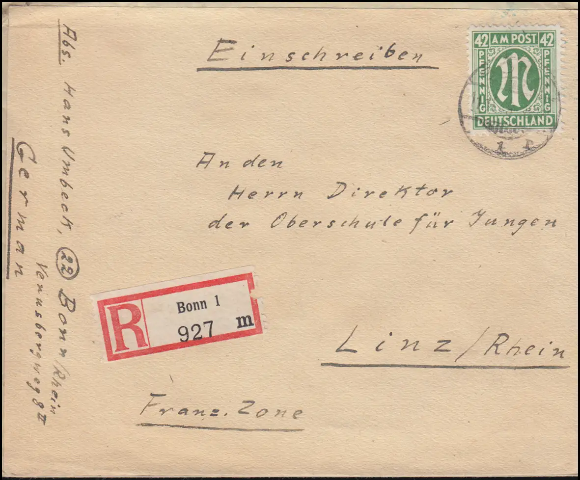 31 AM-Post 42 Pf. en tant qu'EF sur lettre R BONN 11.11.1945 vers Linz / Rhein