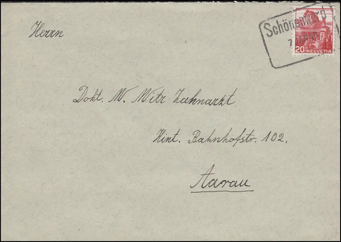 310 marque libre 20 C EF sur lettre Stamp de cadre Schönenwerd 7.1.1949 selon Aarau