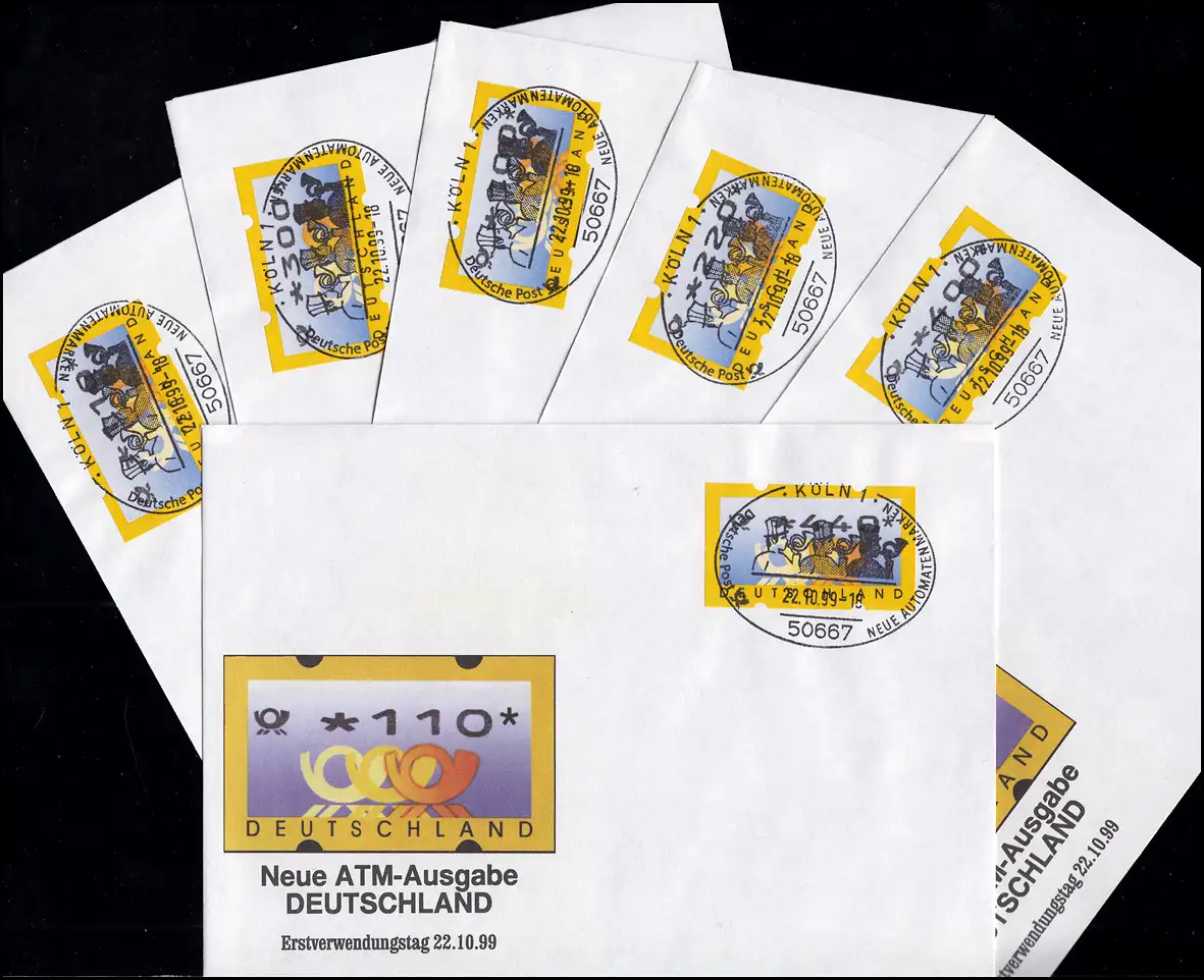 3.2 Cors postaux VS 1 ATM 100-440 Pf., ensemble sur 6 FDC avec ESST Cologne 22.10.99