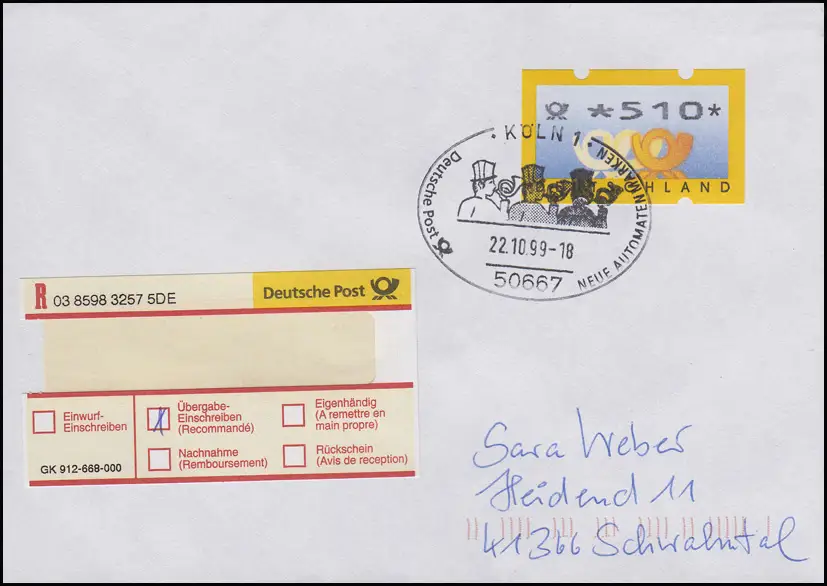 3.2 Posthorner ATM 510 comme lettre de remise EF FDC Cologne 22.10.99, codé