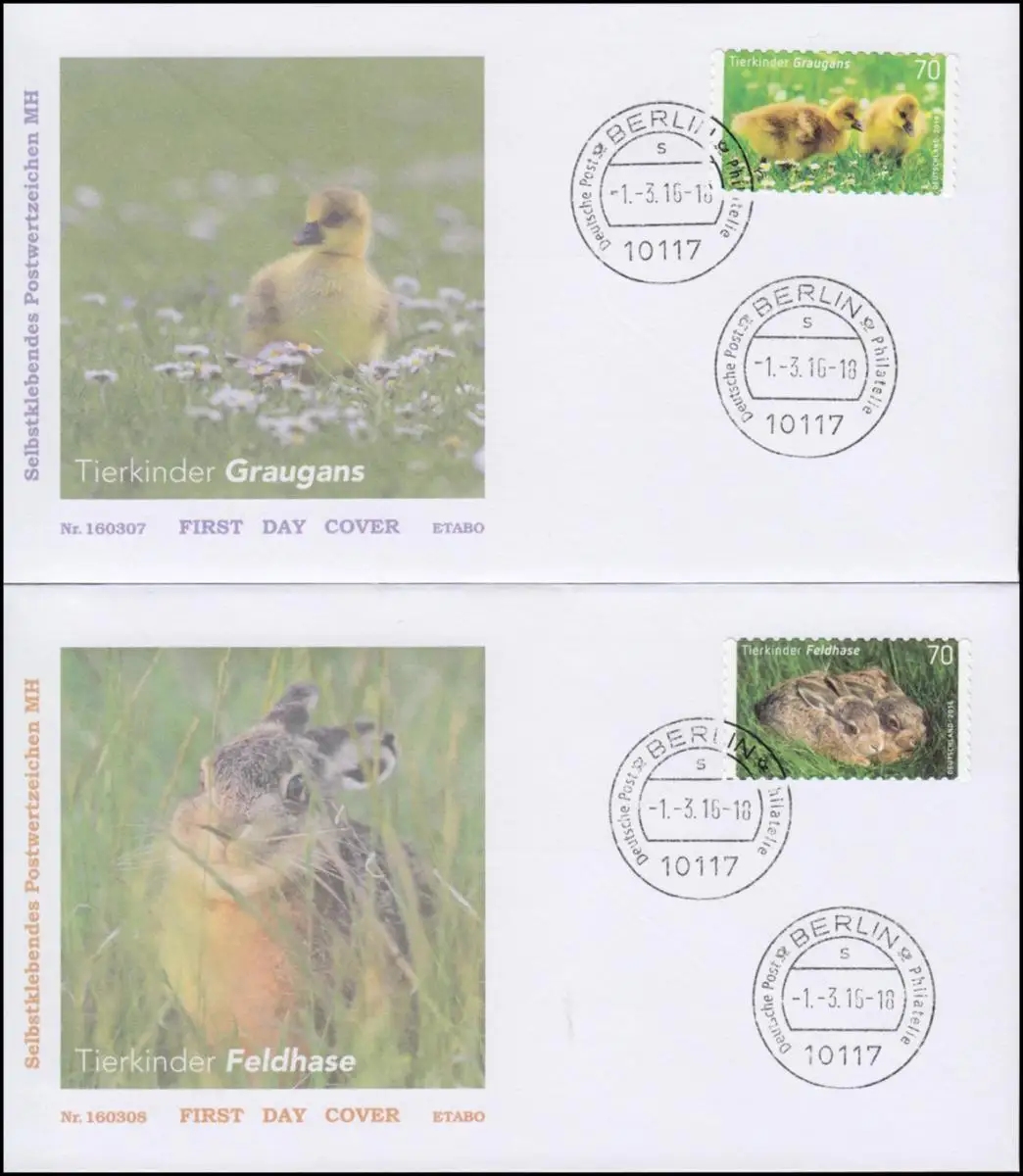 3222-323 Lapins gris et lapin de champ autocollant, ensemble sur 2 FDC VS-O Berlin