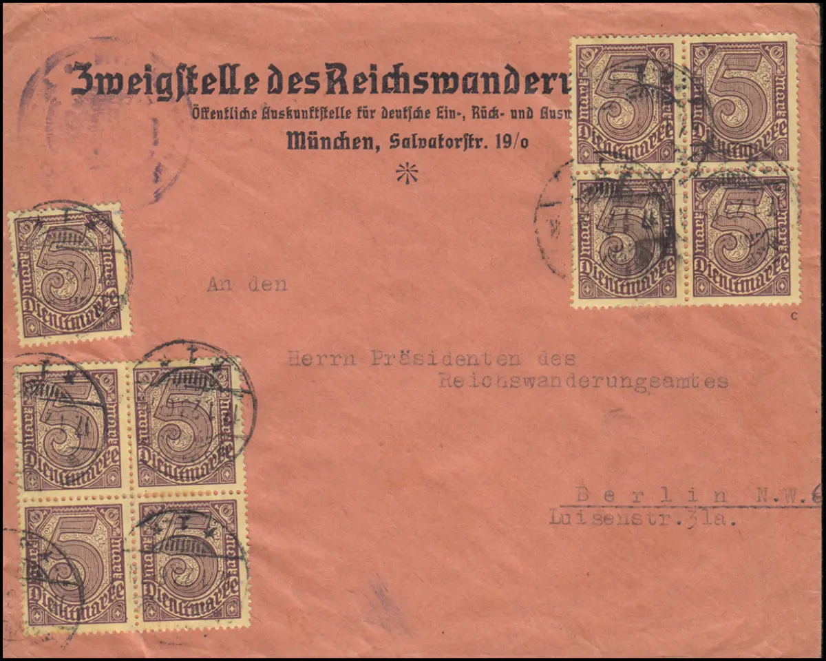 Envoi ouvert deux pages par la branche de l'Office des migrations du Reichsberg à Munich, à son président à Berlin. Valeur de 5 marks en couleur c INFLA-vérifié "sans paroi." N° de catalogue: 33c Vérification: INFLA-/Arge-revisé Numéro d'article: 00000000019506