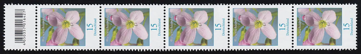 3424 Mousse de prés 15 cents, bande de 5 bandes avec champ de code, grand numéro **