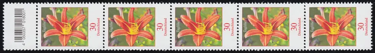 3509 Taglilie 30 cents, bande de 5 bandes avec champ de code **