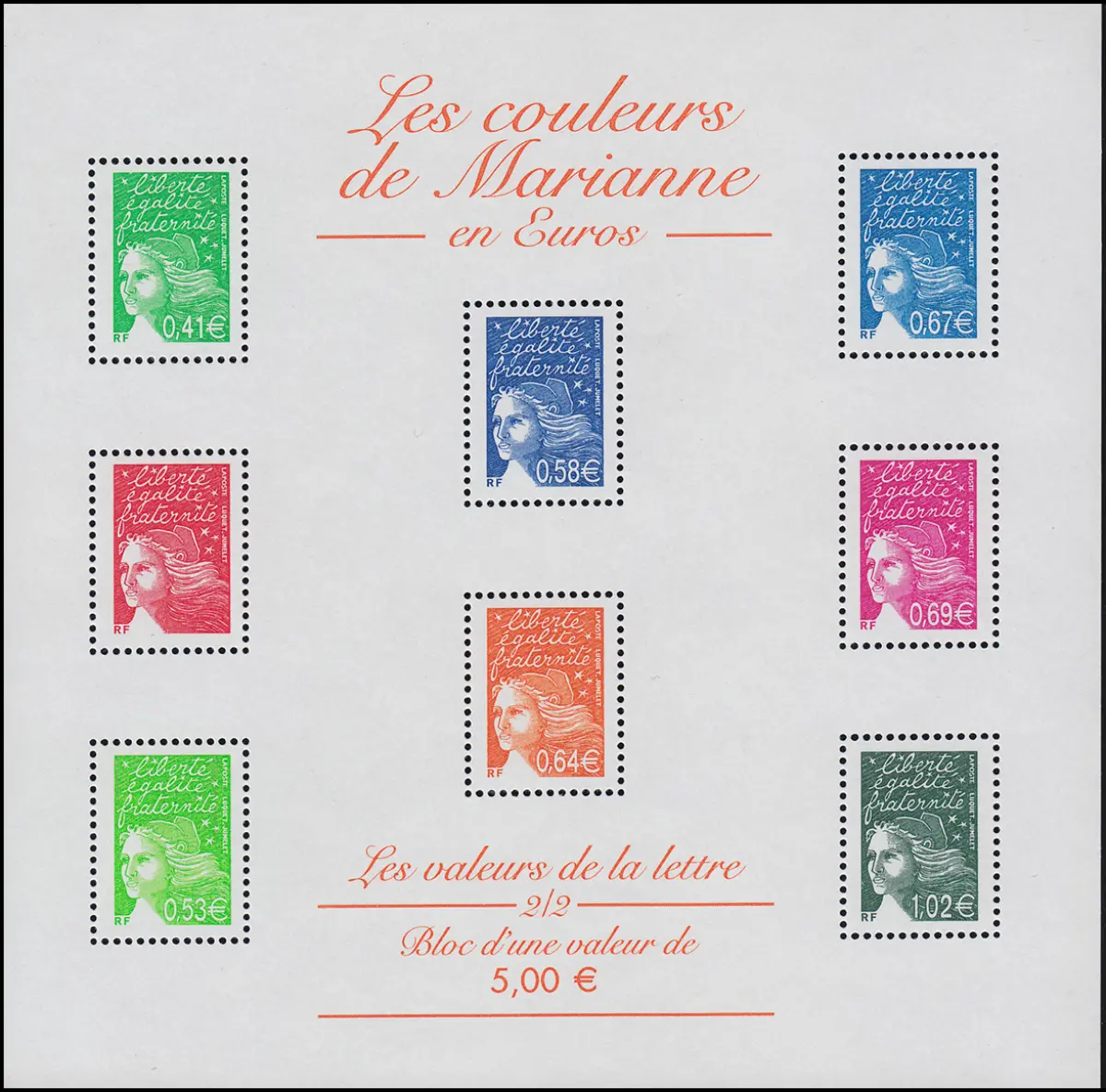 3557-3592 Marques libres Marianne Luquet 2002, petit arc de 8 valeurs **