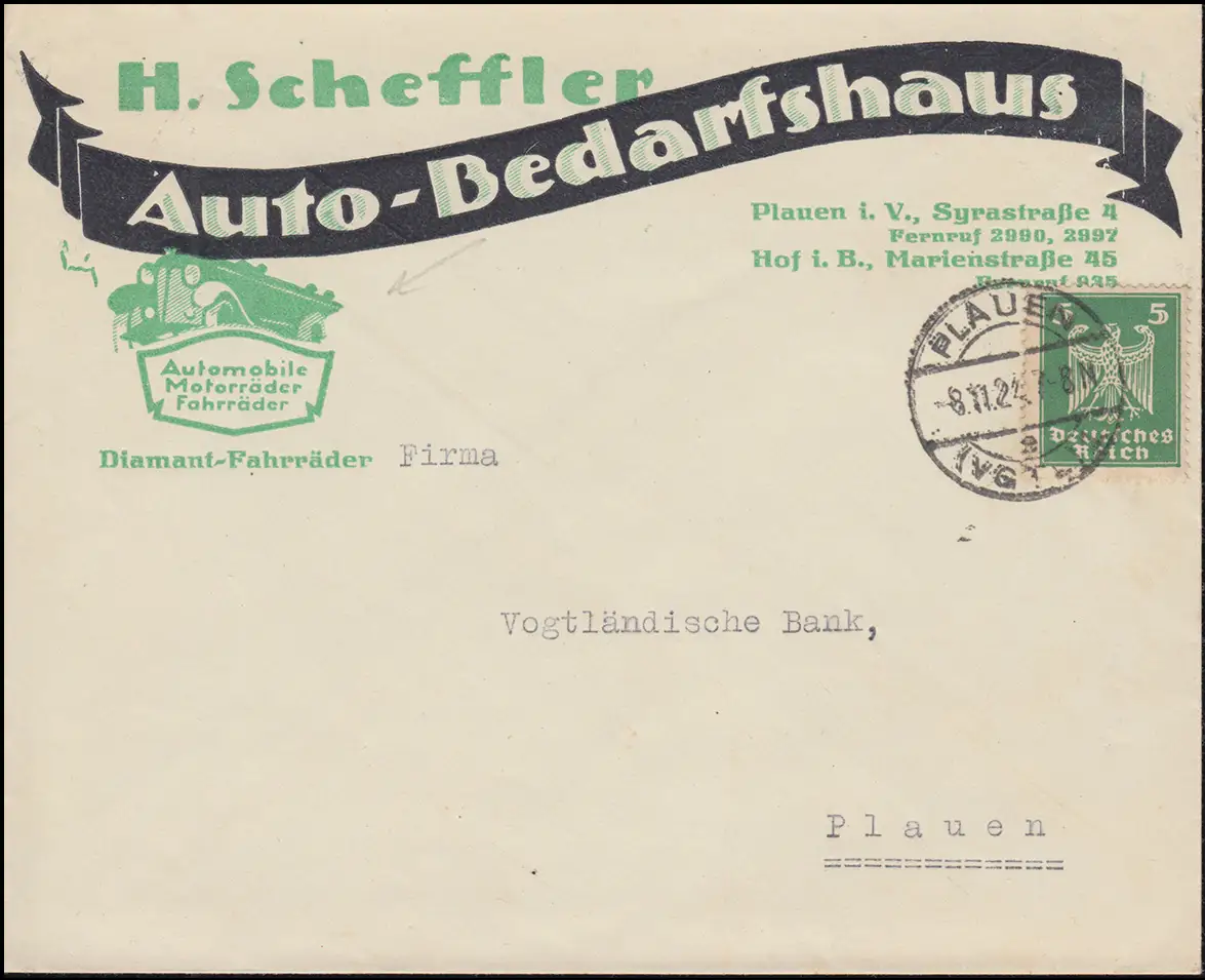 Enveloppe publicitaire de la société Scheffler / Auto-Dessertehaus: Automobiles, Motocycles et Bicyclettes à la Vogtlandische Bank à Plauen N° de catalogue: 356X Examen: original Référence produit: 00000000032783