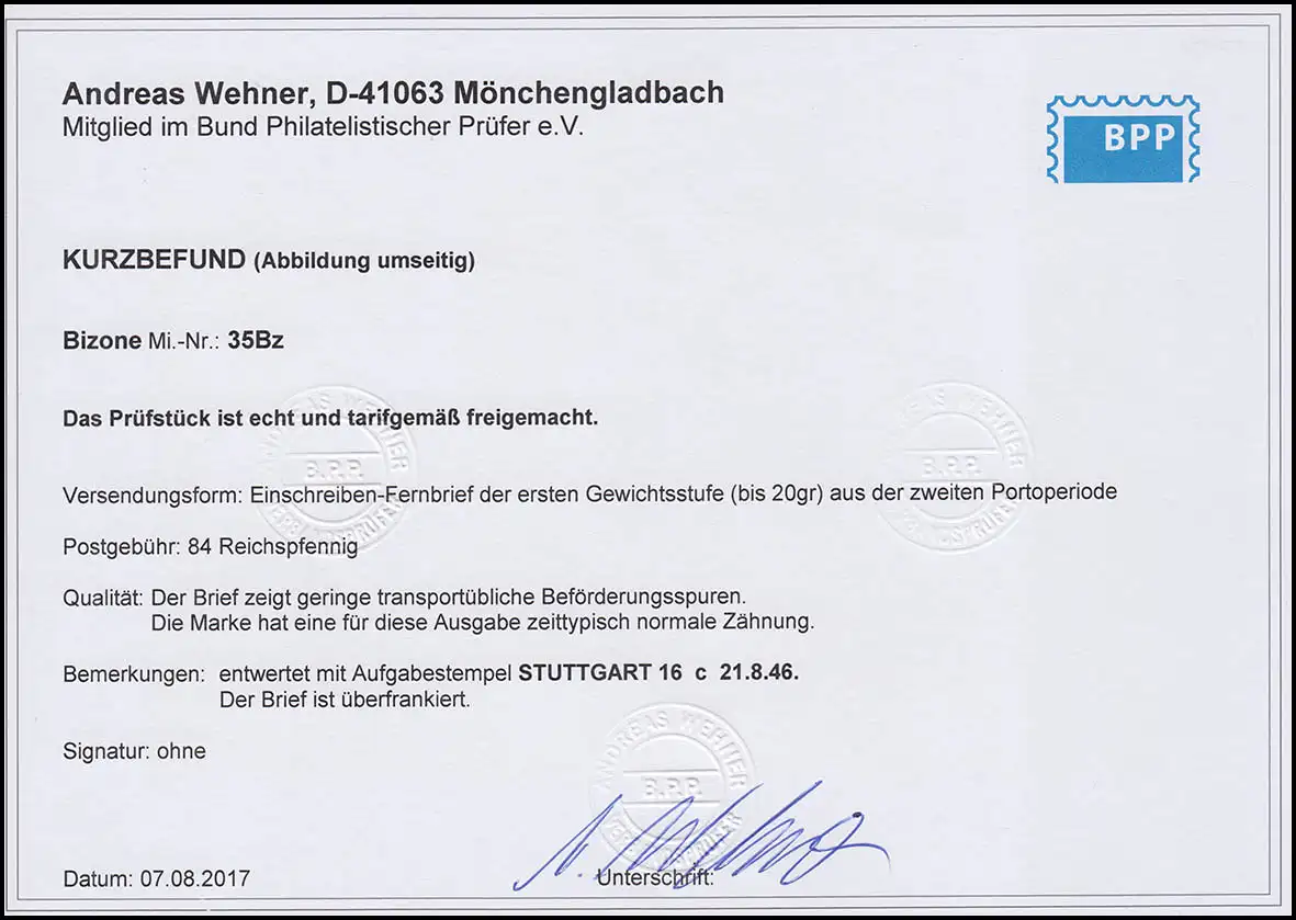 35Bz Deutscher Imprimer AM-Post 1 RM, EF Brief Stuttgart 21.8.46, BPP-Behner-Wehner