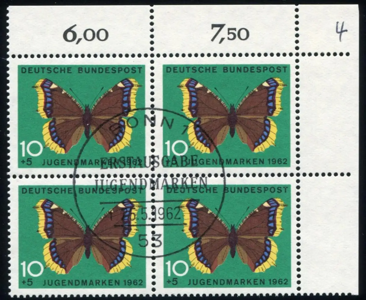 Bloc de quatre d'angle en haut à droite, marqué avec une erreur de plaque: trait vert dans le jaune de l'aile à gauche Numéro de catalogue: 377 Examen: original Référence produit: 00000000004045>p>Remarque: Cet article n'est disponible qu'une fois. Vous recevrez exactement l 'article représenté.