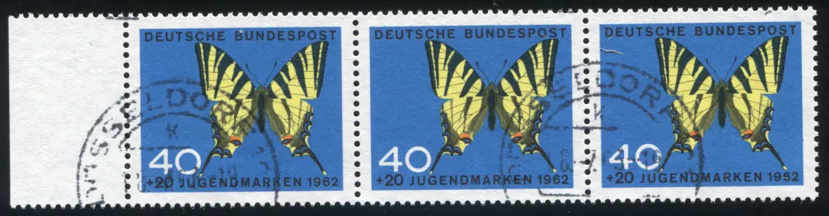 Bandes de trois bordures à gauche avec défauts de plaque, timbre rond DÜSSELDORF 18.7.1963 Numéro de catalogue: 379 Examen: original Référence produit: 00000000004237