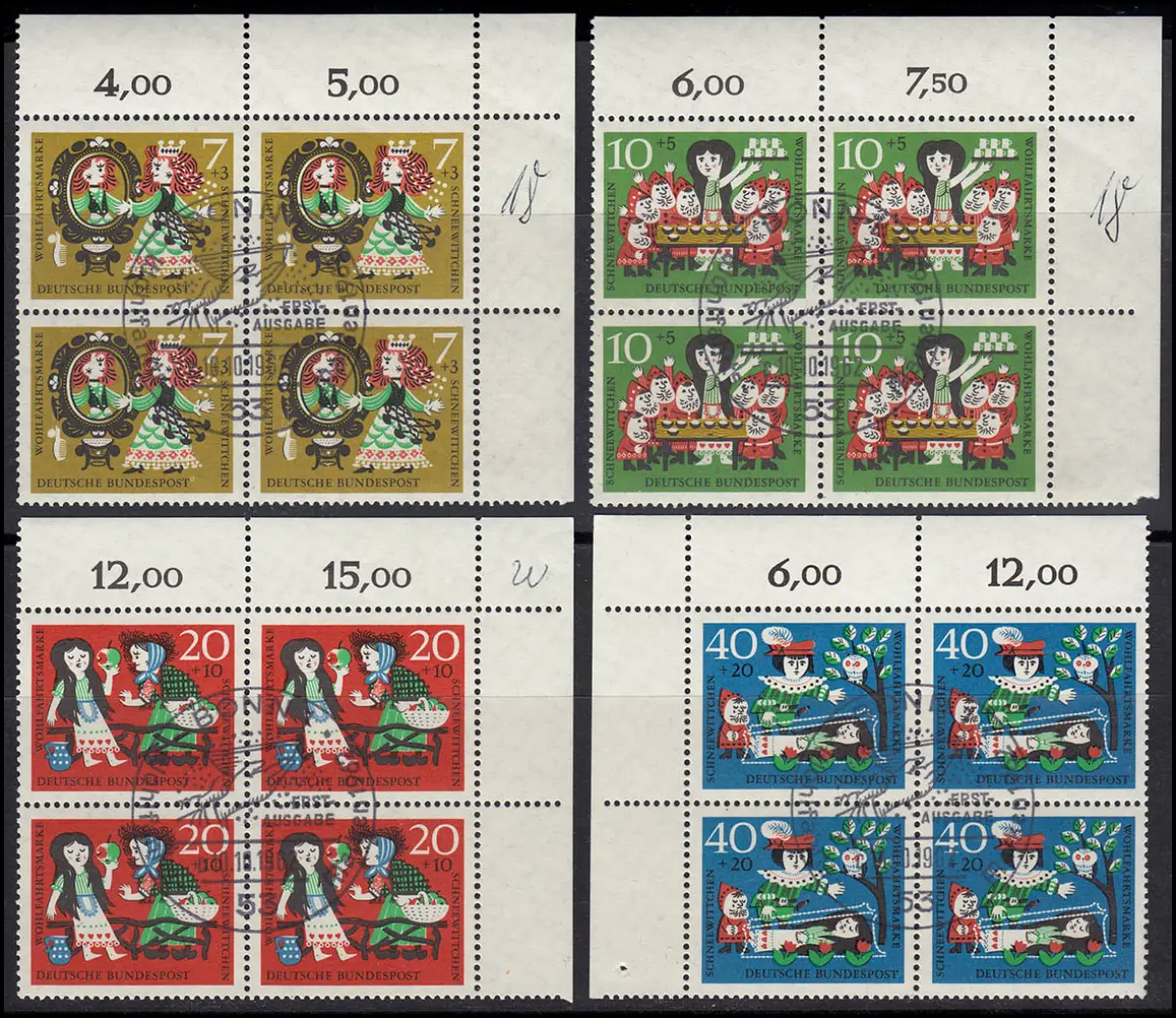 385-388 Wofa 1962 Schneewittchen Satz Eck-Vbl. oben, ESSt BONN 10.10.62