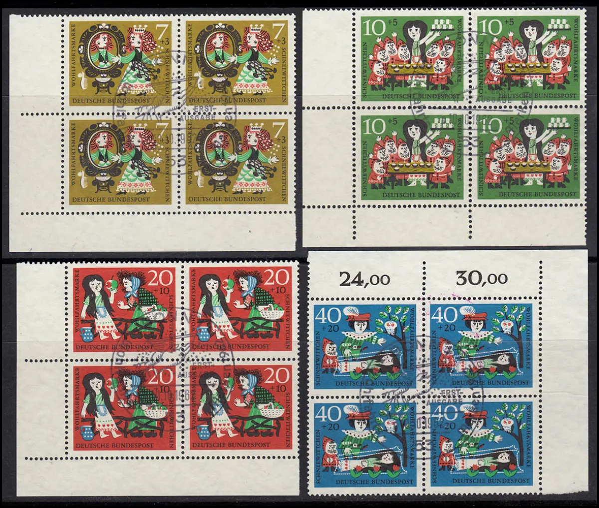 385-388 Wofa 1962 Schneewittchen Satz Eckrand-Viererblöcke, ESSt BONN 10.10.62