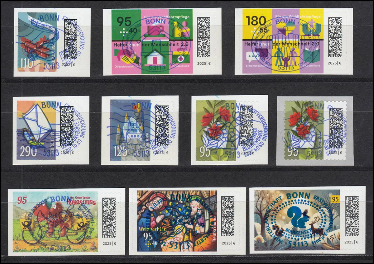 Alle 2025 verausgabten neun selbstklebenden Marken aus Folienblättern komplett mit dem Erstverwendungsstempel BONN als sauber lesbarer Vollstempel. Zusätzlich noch die 95 Cent Welt der Briefe, die auch als selbstklebende Rollenmarke erschienen ist - ebenfalls mit Vollstempel - so wie abgebildet.