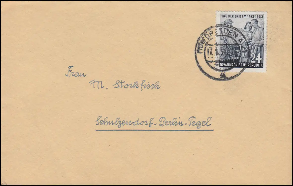 396 Journée du timbre 1953 comme EF sur lettre DRESDEN 17.1.1954 à Berlin-Tegel
