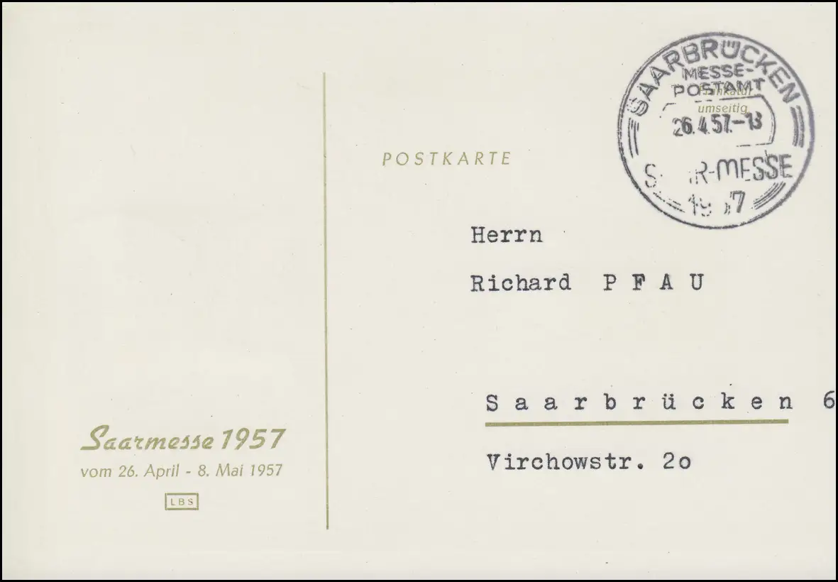 400 Saarmense 1957 sur carte d'exposition SSt SARBRÜCK 26.4.1957