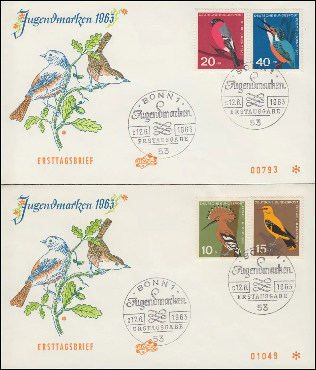 401-404 Jeunes oiseaux indigènes 1963: phrase sur 2 FIDACOS-FDC ESSt BONN 12.6.63