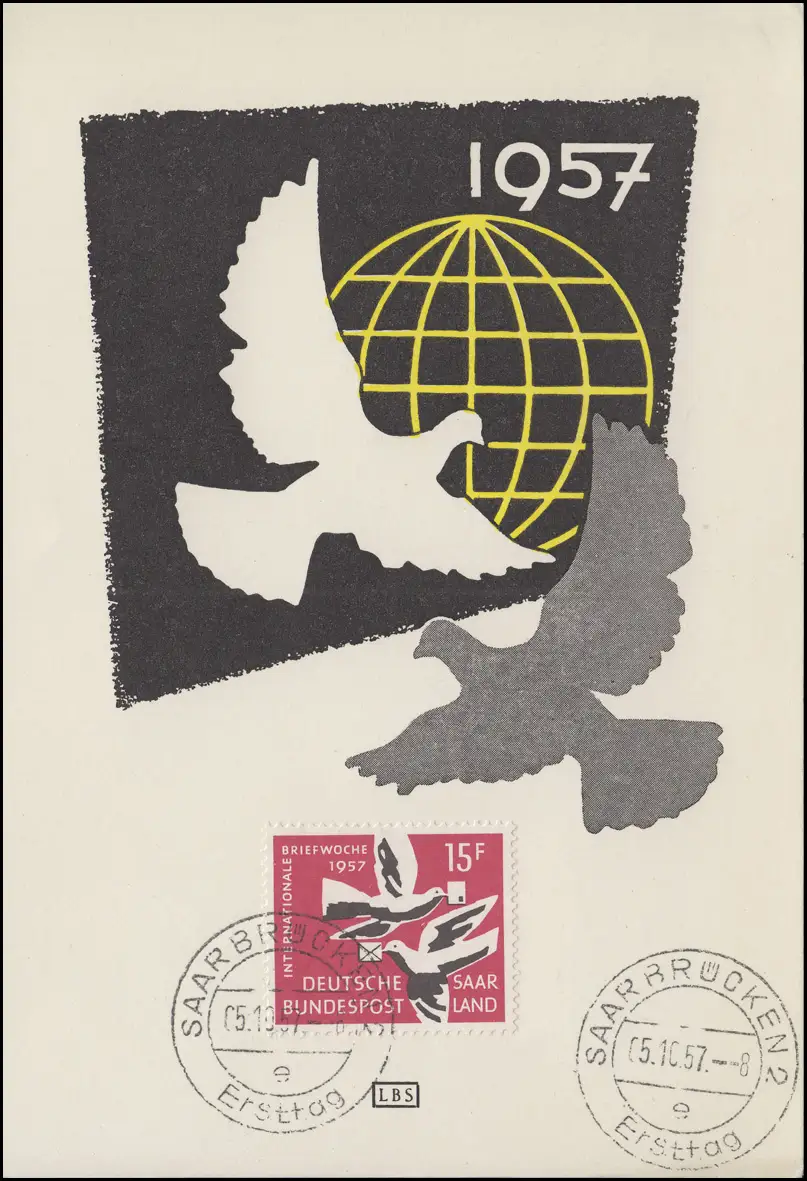 408 Semaine de correspondance 1957 sur carte maximale cachet de première journée SAARBRÜCK 5.10.1957
