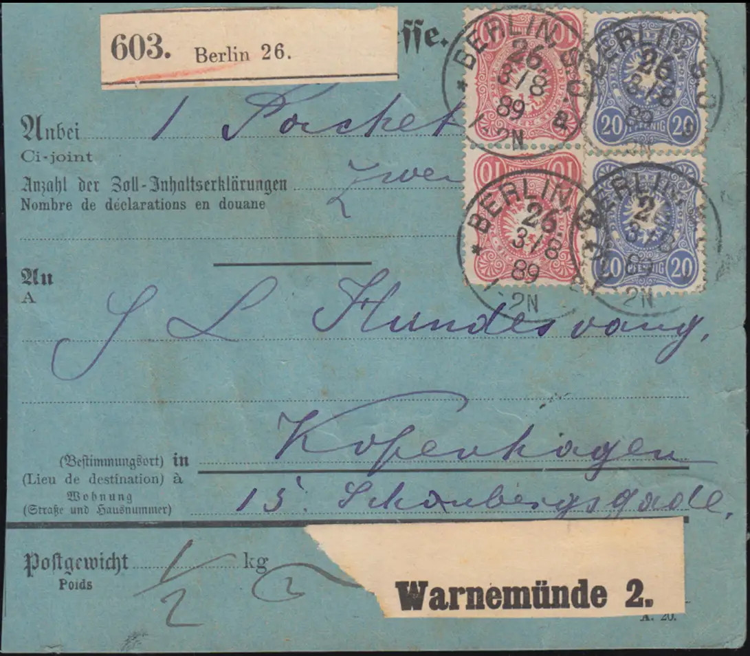 41+42 francs PFENNIG sur le paquet BERLIN 3.8.89 vers COPENHAGEN 5.8.