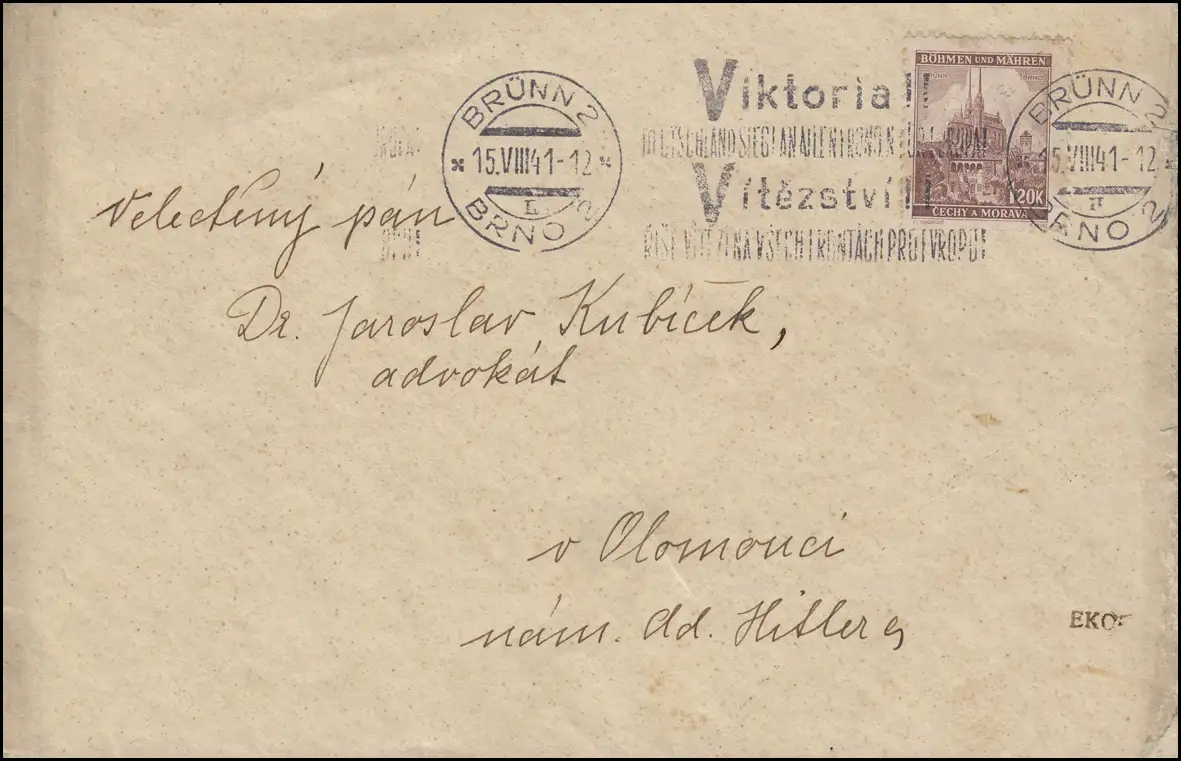 41 Brno 1,20 K en tant que EF sur lettre avec le cachet de Victoria BRünN 15.8.41 n. Olomouci