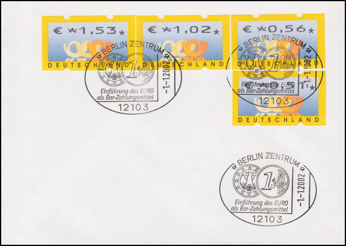 Timbre spécial de premier jour "BERLIN CENTRE Introduction de l'euro en tant que moyen de paiement BAR" avec fonctionnalité ATM Numéro de catalogue: 4.1 Vérification: original Numéro d'article: 00000000028001>Note: Cet article n'est disponible qu'une seule fois. Vous recevrez exactement l ' article représenté.