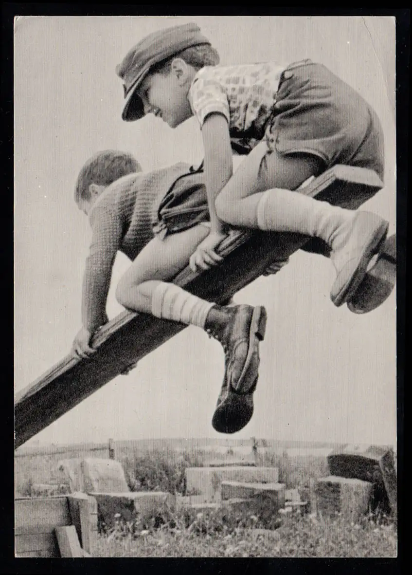 Carte de vue photo: Deux garçons sur le bide / poème: Les enfants sont des mystères de Dieu, ... N° de catalogue: 416 Examen: original Référence produit: 00000000045523