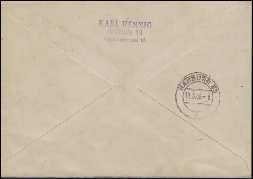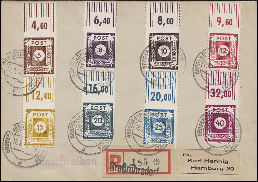 5 à 40 pfennigs avec bord supérieur SANS les 6 pence rares sur lettre recommandée GROSSDORF 16.2.46 avec un billet de secours R selon HAMBURG, cachet d'arrivée 11.3.46 N° de catalogue: 42-50 Vérification: original Référence produit: 00000000016769>Note: Cet article n'est disponible qu'une fois. Vous recevrez exactement l'article représenté.