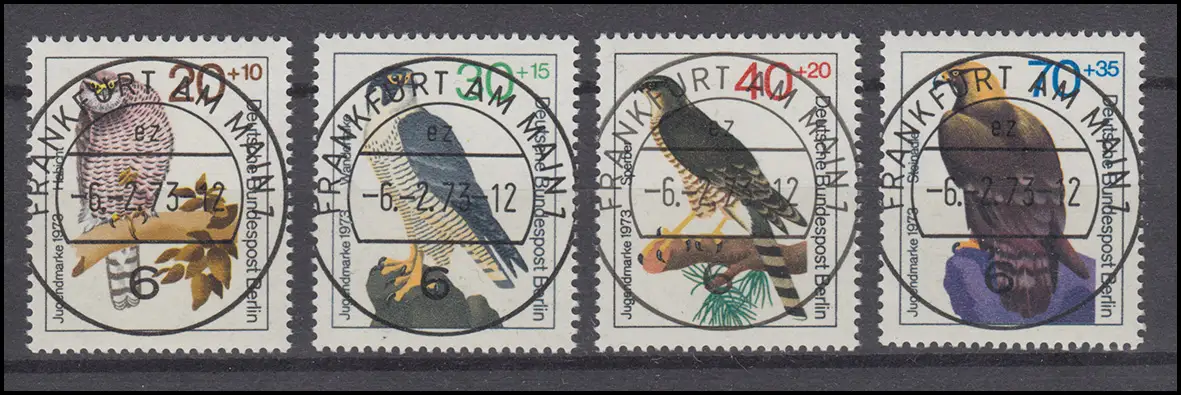 442-445 Jeunes oiseaux de proie 1973 - Ensemble avec cachet complet Service d'expédition FRANKFURT/M.