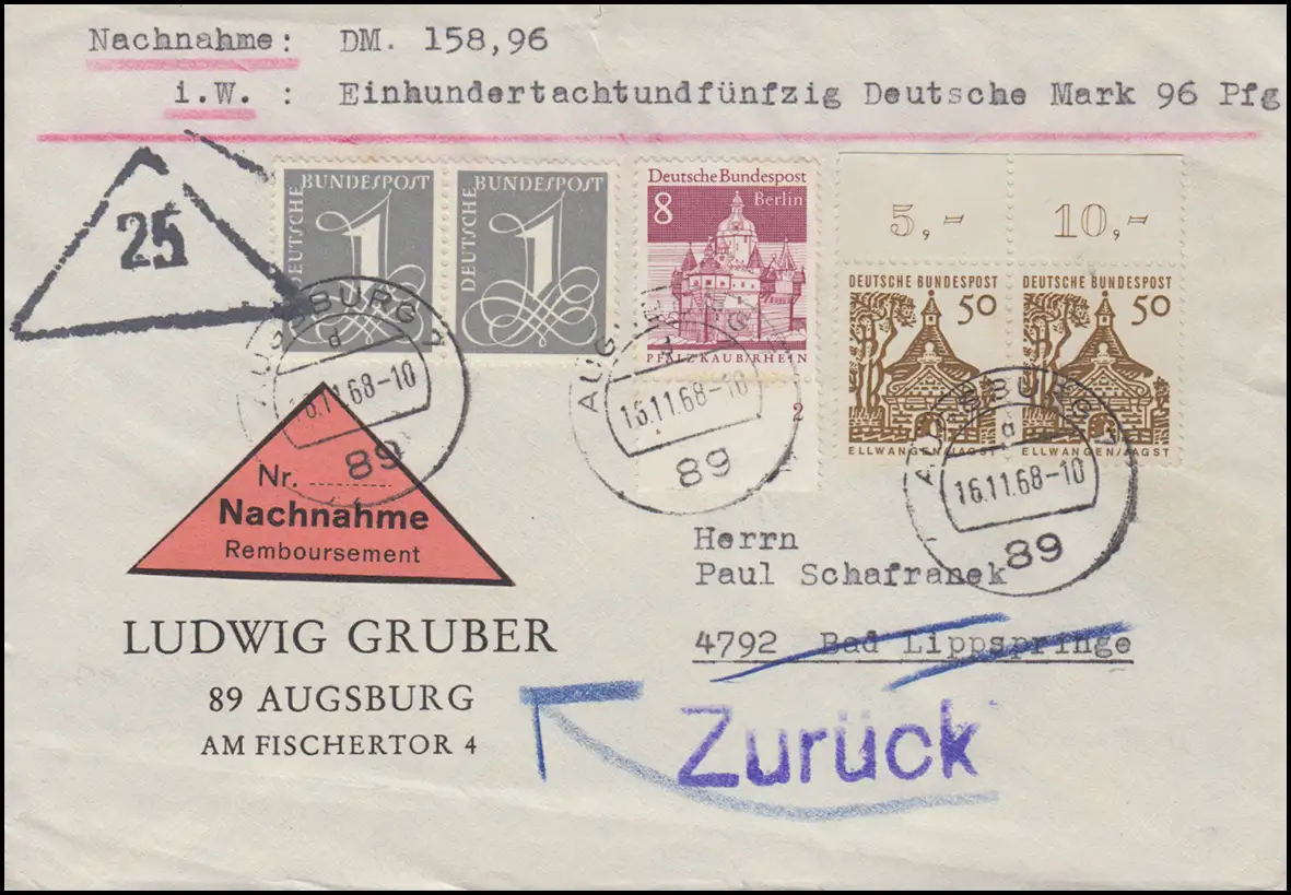 458 Superrand-Paar + ZF sur la lettre de demande NN AUGBURG 16.11.1968 et Retour-O