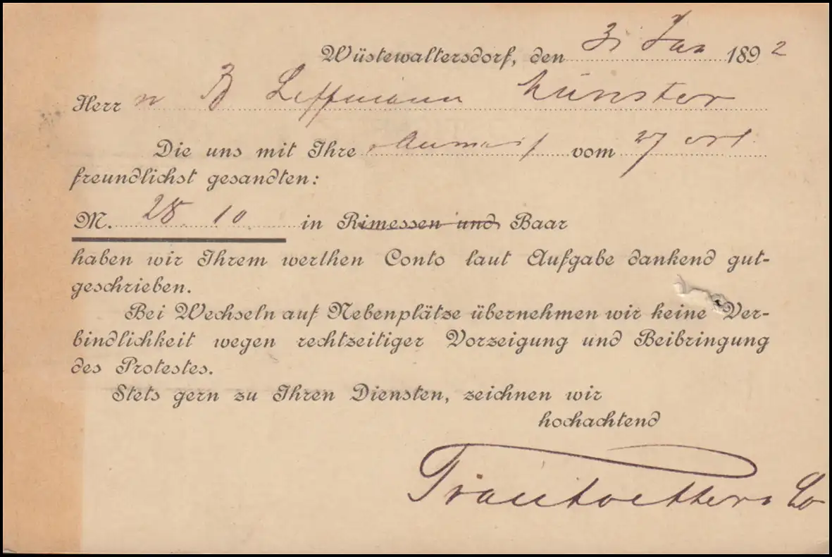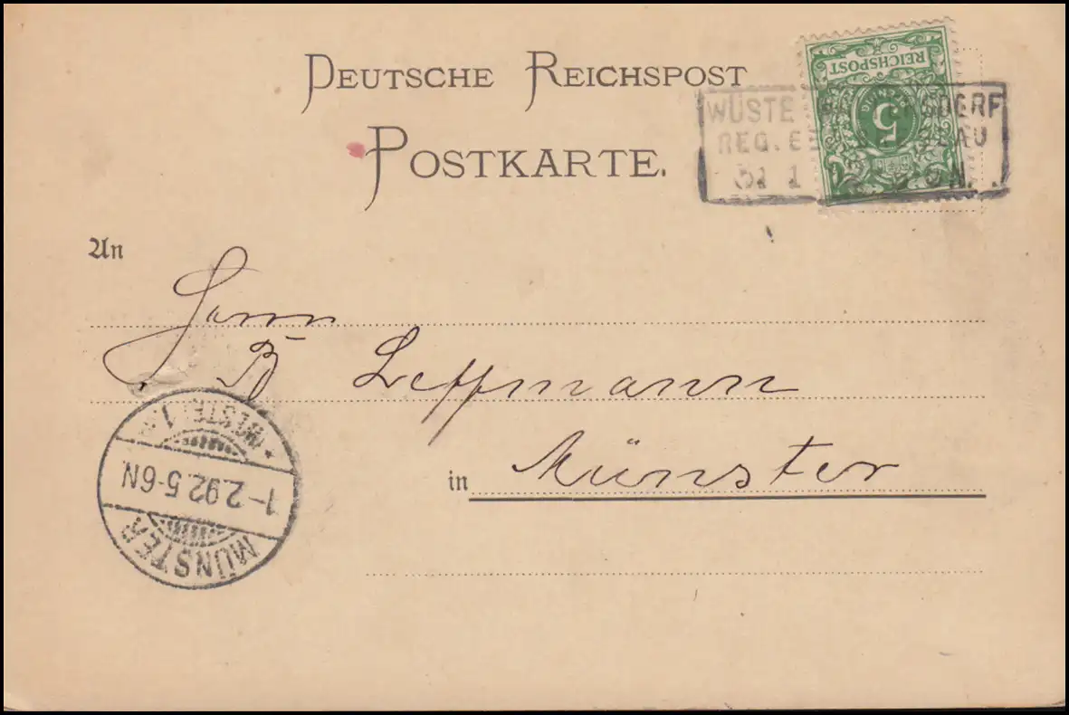 46 Point 5 Carte postale Tampon de caisse WÜSTE WALTERSDORF / BRESLAU 31.1.1892