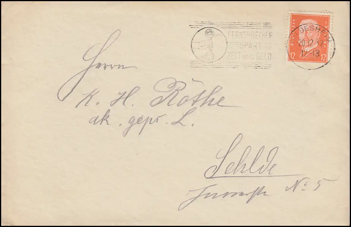 466 Hindenburg 12 p. pt. comme lettre EF HILDESHEIM Téléphone 20.12.32 selon Sehlde