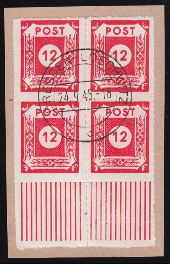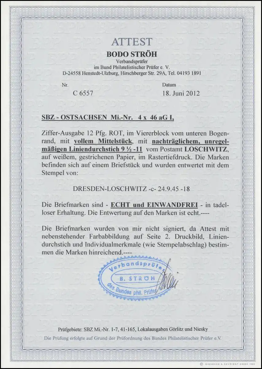 46AG I chiffres 12 Pf. Loschwitz, pile pleine, bloc à quatre O, FA Ströh BPP