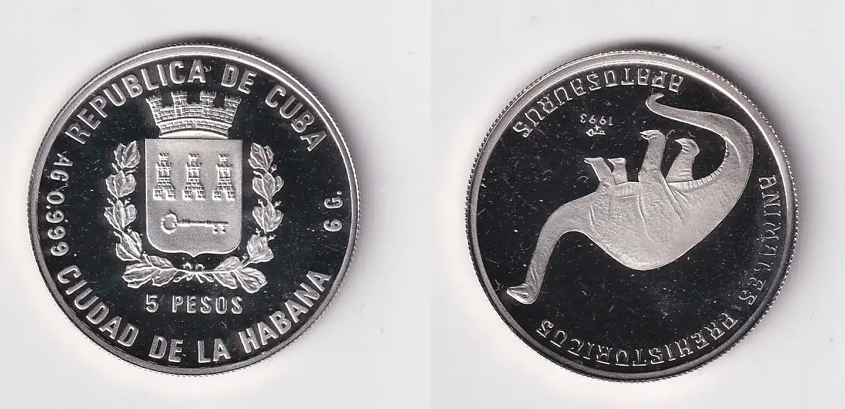 5 Pesos Silber Münze Kuba 1993 Urzeittiere Apatosaurus 6g 999 Ag (119148)