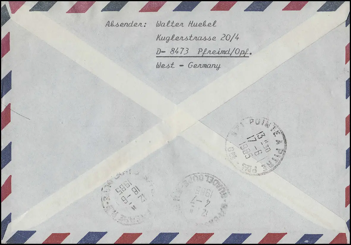505 IuT deux fois 160 p. sur lettre R extérieure FREIMD 13.6.85 vers la Guadeloupe