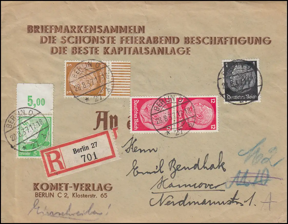 Envoi recommandé par l'éditeur KOMET avec publicité "Rassemblement des timbres / La plus belle fin de journée Emploi / Le meilleur investissement," timbre d'arrivée HANNOVER 29.8.37. N° de catalogue: 529ff Examen: original Référence produit: 00000000019034>p>Remarque: Cet article n'est disponible qu'une seule fois. Vous recevrez exactement l 'article représenté.