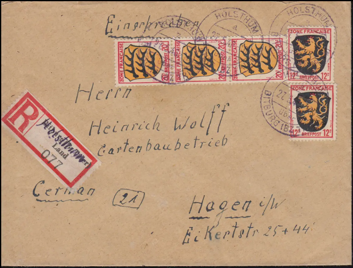 6+8 Marques libres Armoiries 12+20 Pf MiF sur lettre R de secours-R-Zettel HÜLSTHUM 27.5.1946
