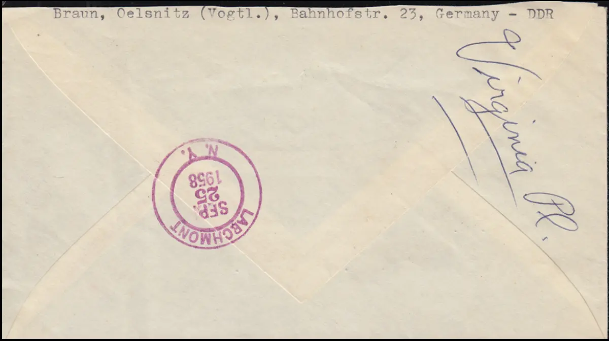 611+613 timbres postaux 35 pf. et 1 DM sur lettre Lp.-R OLSNITZ (VOGTL) 21.9.58