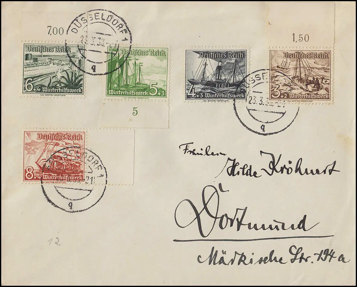 651-655 WHW navires 3 - 8 Pf sur lettre, 5 valeurs, DÜSSELDORF 23.3.38