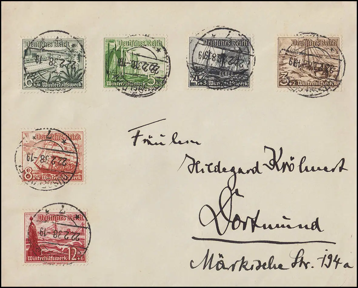 651-656 navires WHW 3-12 Pf sur lettre (6 valeurs) DÜSSELDORF 22.2.1938