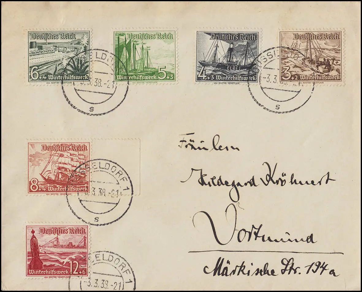 651-656 navires WHW 3 à 12 pf. sur lettre, 6 valeurs, DÜSSELDORF 3.3.38