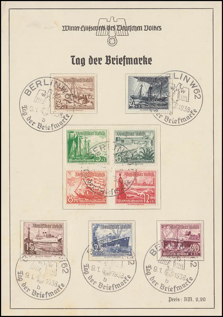 Kompletter Satz auf Spenden-Gedenkblatt im A5-Format zum Tag der Briefmarke 1938. Sonderstempel Berlin W 62 WHW Tag der Briefmarke. Das Gedenkblatt hat kleine Mängel / fleckig.