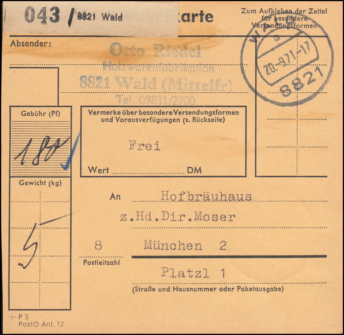 690 Heinemann 60 Pfennig en MeF sur carte de paquet WALD 20.9.1971 à Munich