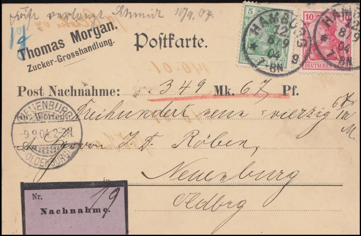 70+71 Germania MiF Carte postale HAMBURG 8.9.1904 vers Neuenburg 9.9.04