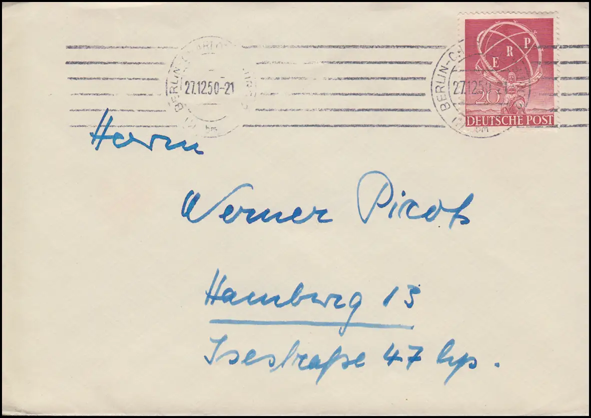 71 ERP en tant qu'EF sur lettre BERLIN-CHARLOTTENBURG 27.12.50 à Hambourg