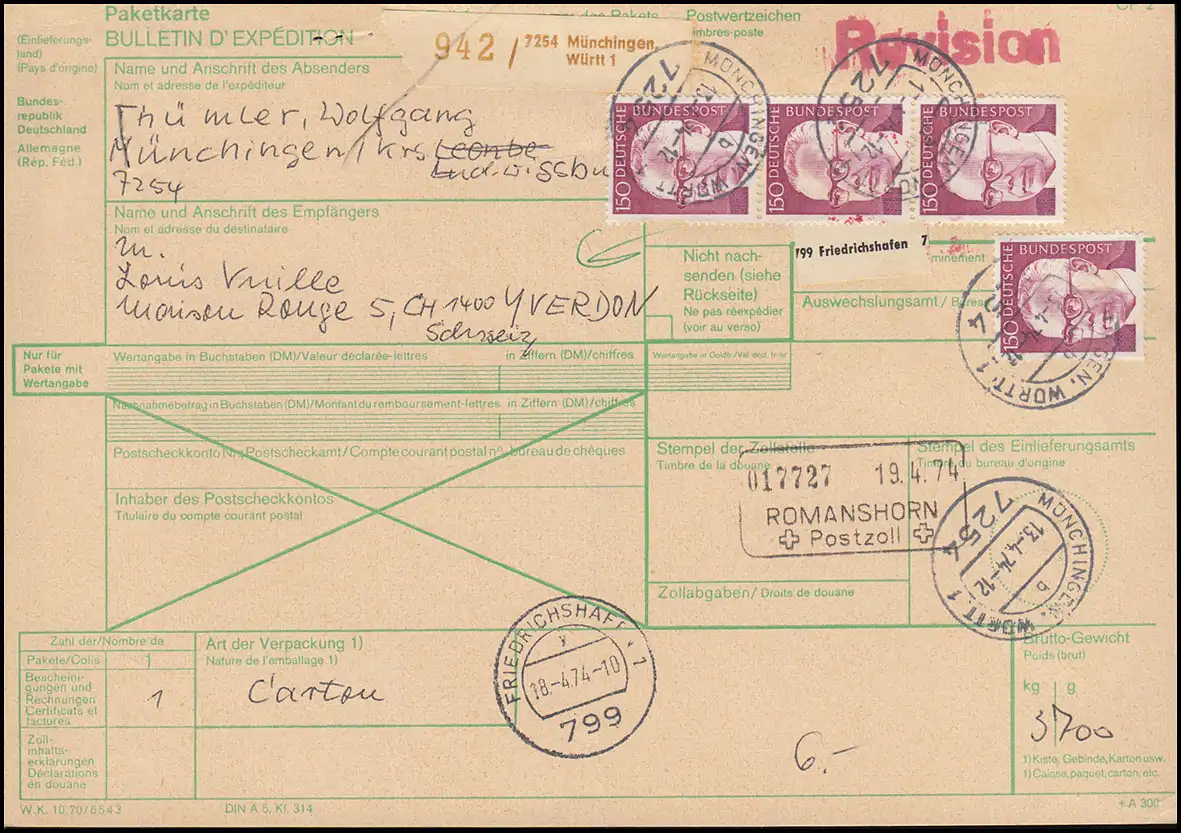 730 Heinemann 4 fois 150 pf. sur carte de paquets internationaux MÜNCHINGEN 13.4.1974