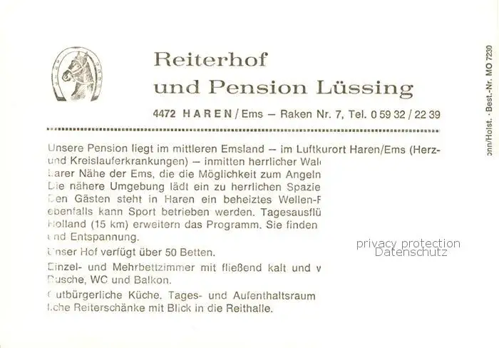 73849421 Haren_Ems Reiterhof und Pension Luessing Gaststube Reithalle Haren_Ems postalisch nicht gelaufen nach 1965 Werbekarte (keine Postkarte) Erhaltung siehe scans [FriedD77] Werbekarte (keine Postkarte)[Frierer ]