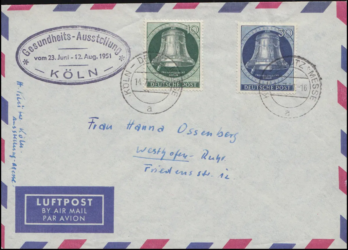 76+78 Cloche 10+30 Pfennig Boulons à gauche Lp Lettre KÖLN-DEUTZ Messe 14.7.51